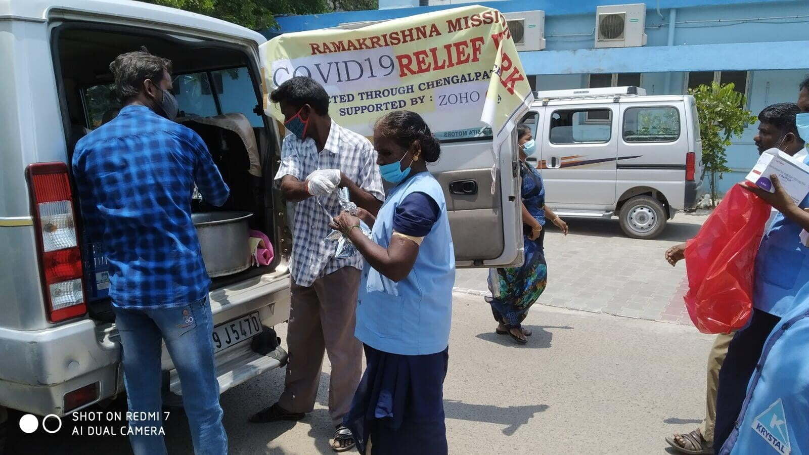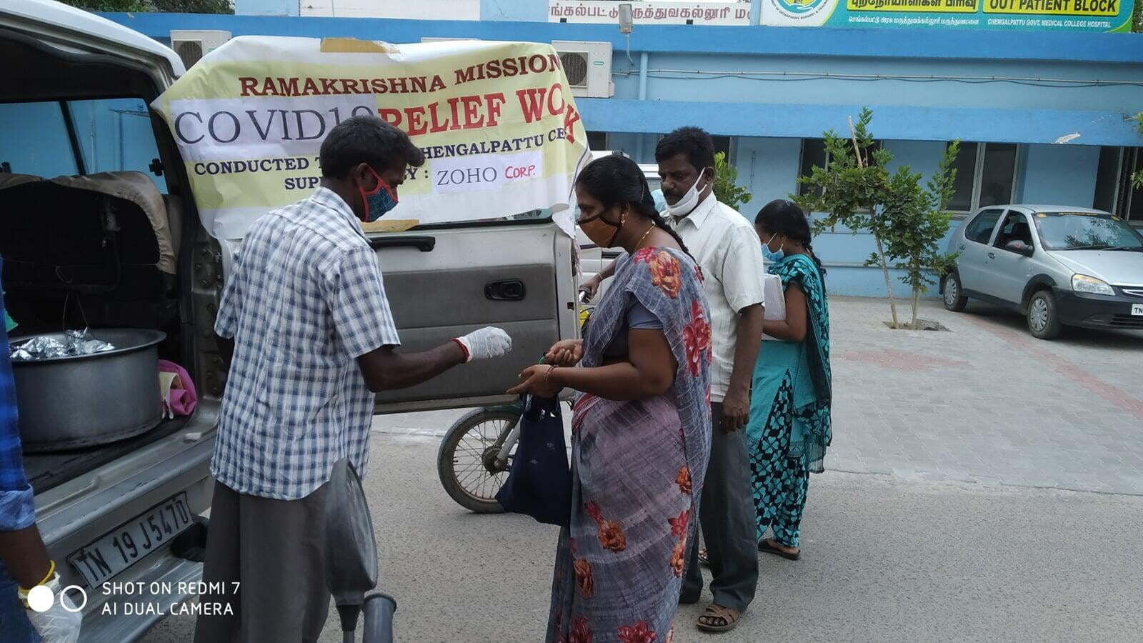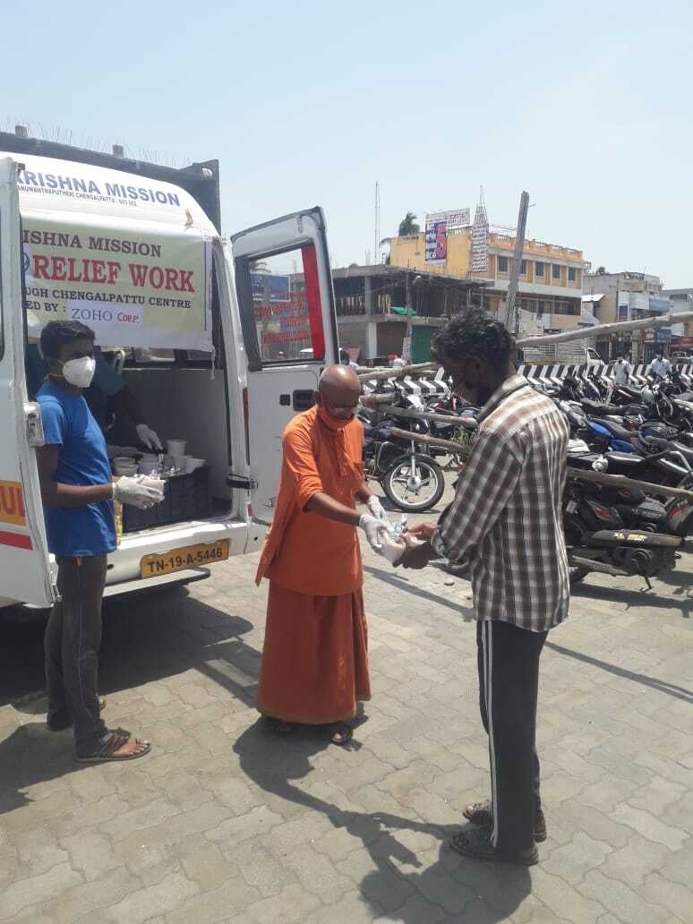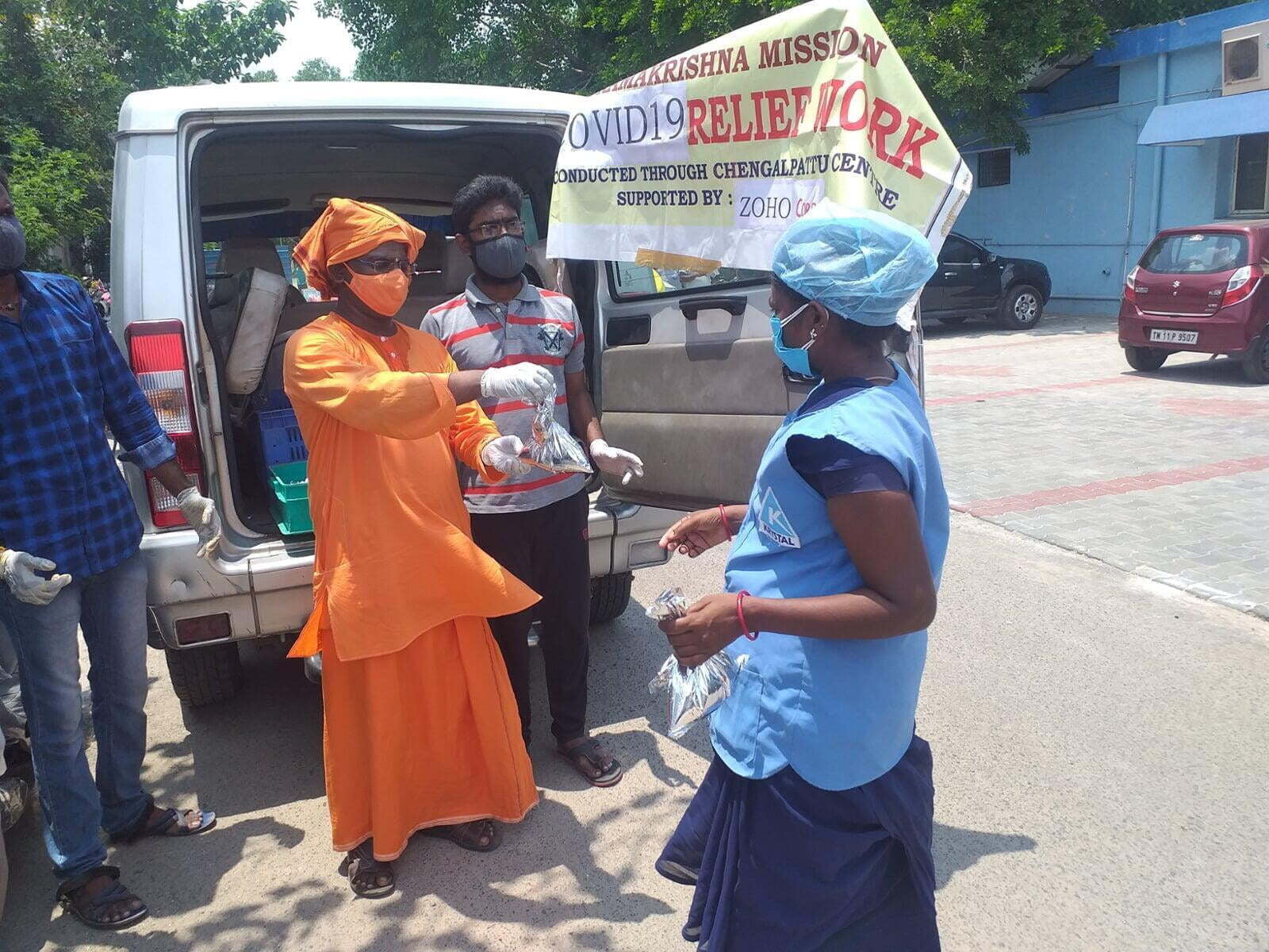 Ramakrishna Mission, Chengalpattu has started relief assistance with 200 hot lunch packets made in Zoho Kitchens served to Covid-19 affected families, ambulance drivers, hospital sanitation workers outside Govt. General Hospital, Chengalpattu.