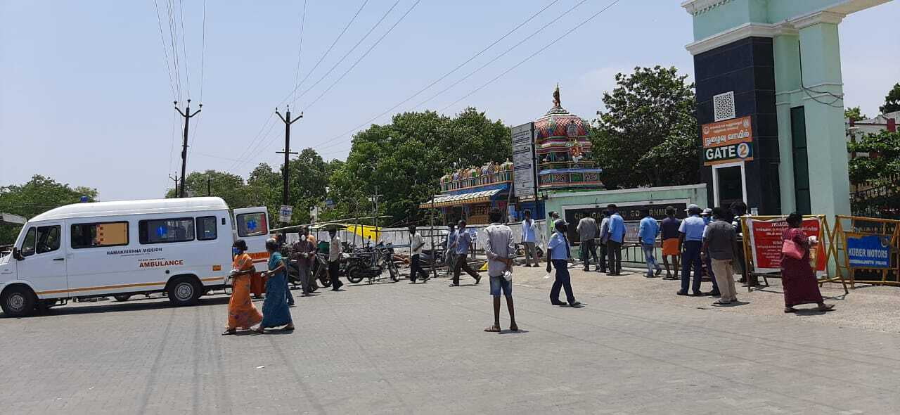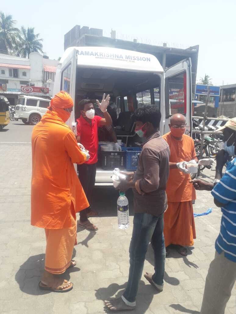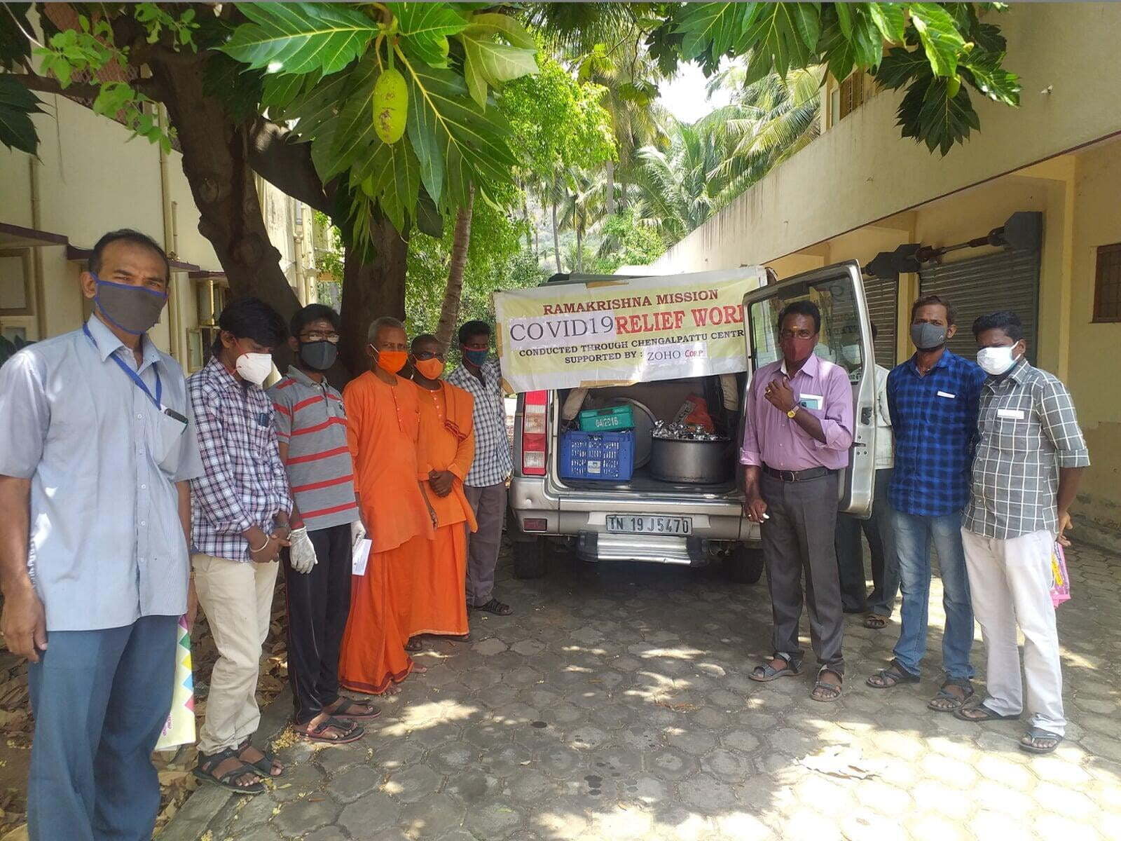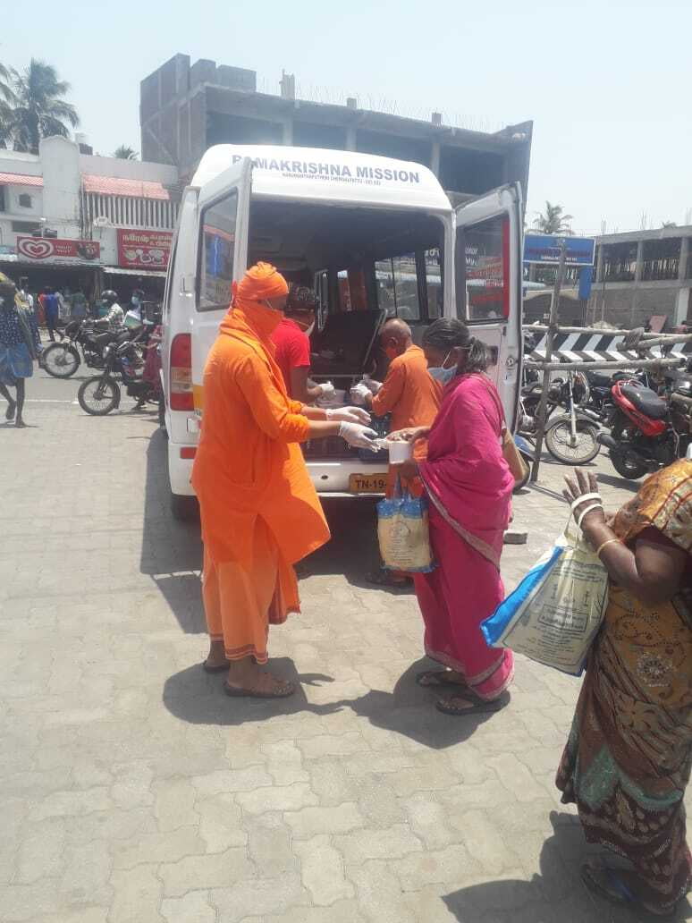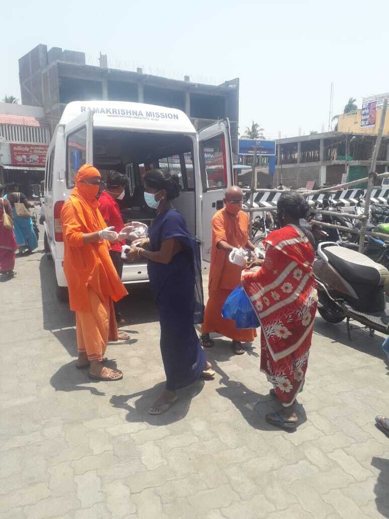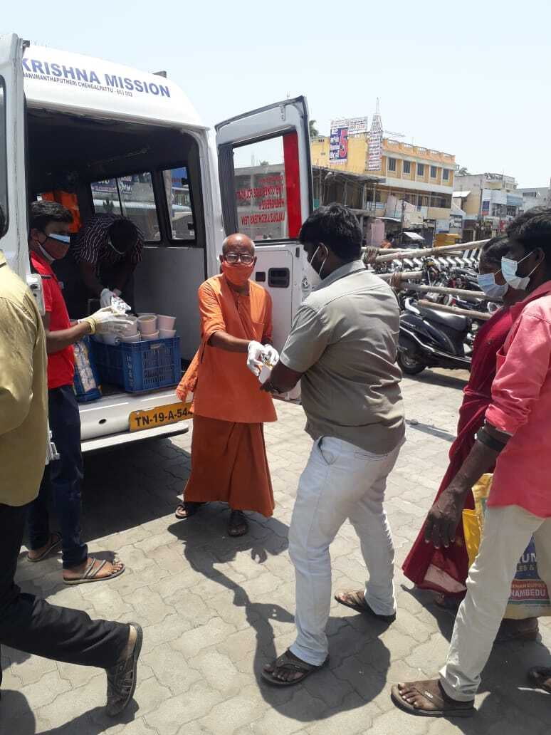 Ramakrishna Mission, Chengalpattu has started relief assistance with 200 hot lunch packets made in Zoho Kitchens served to Covid-19 affected families, ambulance drivers, hospital sanitation workers outside Govt. General Hospital, Chengalpattu.
