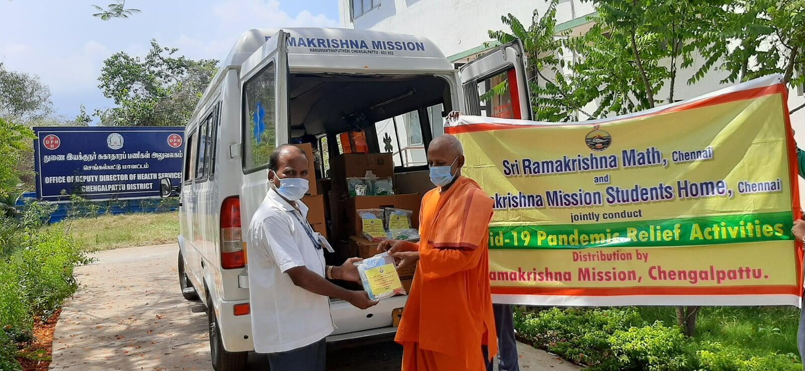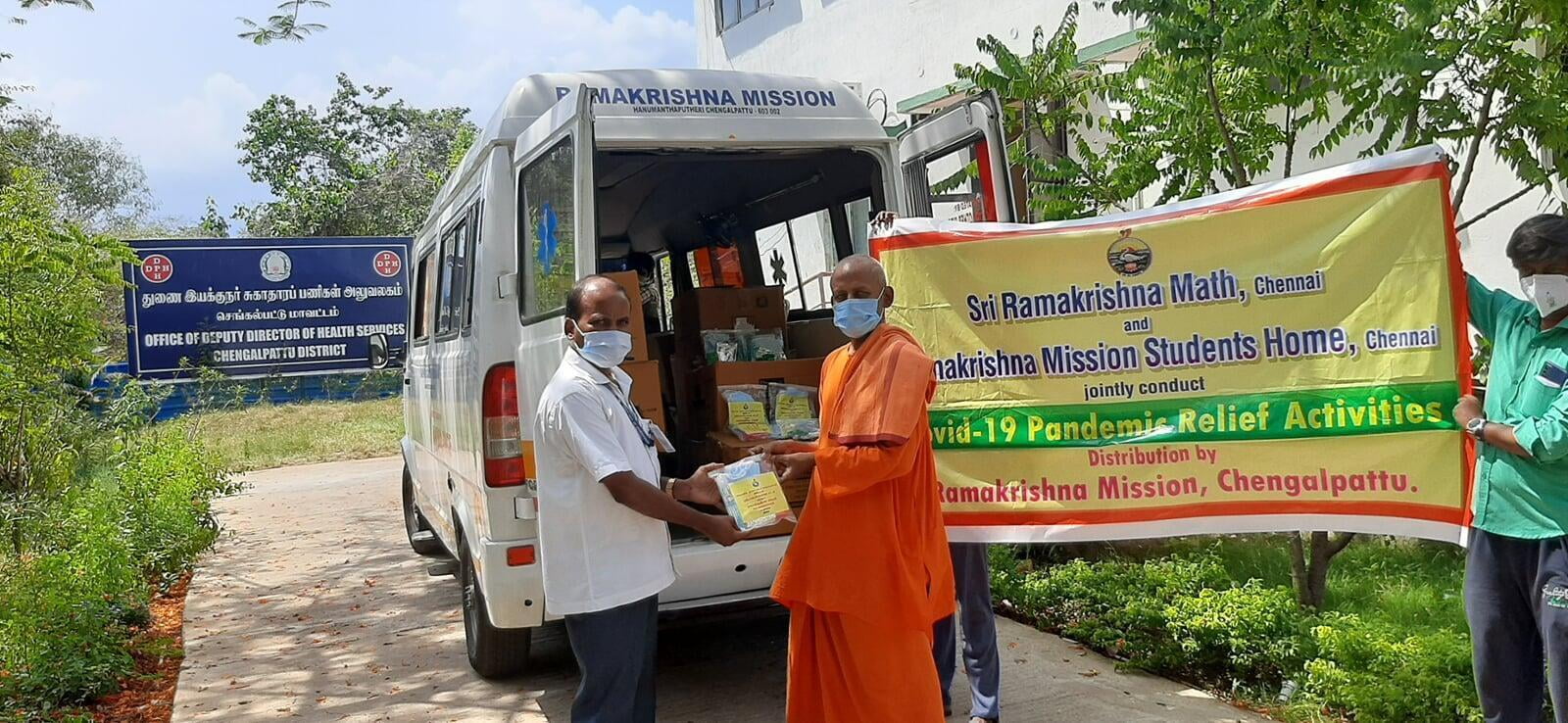 Dear Devotees and well wishers of the Ramakrishna Math & Ramakrishna mission, By the Grace of the Divine Trio, 4th June, we have handed over 1000 Covid Relief kits to DDHS,Chengalpattu. Each covid kit contains: masks, hand sanitizer, soap,medicinal powder Covid Relief kits are Jointly provided by Ramakrishna Math chennai & Ramakrishna Mission Students Home ,Chennai